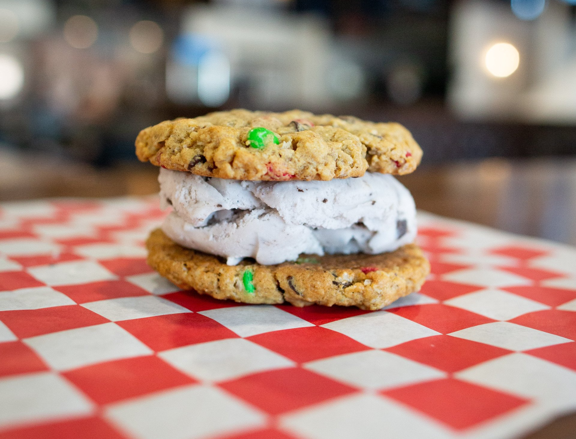 Choose any flavor of ice cream or cookie dough to devour between two delicious homemade gluten-free monster cookies, made locally from Beyond the Bar Bakery!