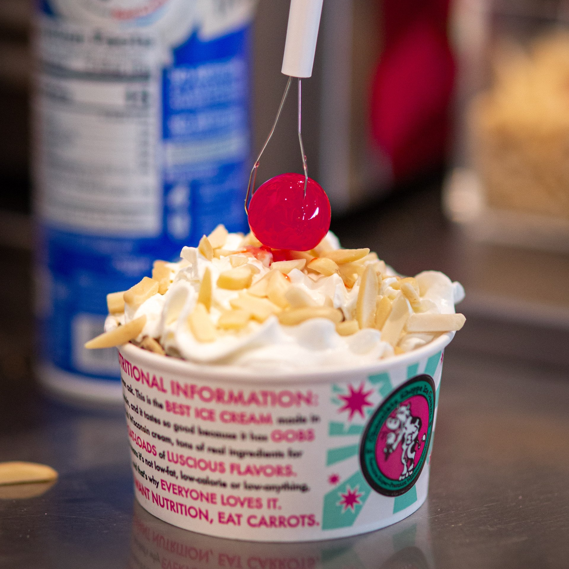 The literal cherry on top. Choose any flavor of ice cream, any topping and we'll finish it off with whipped cream, almonds and a cherry.